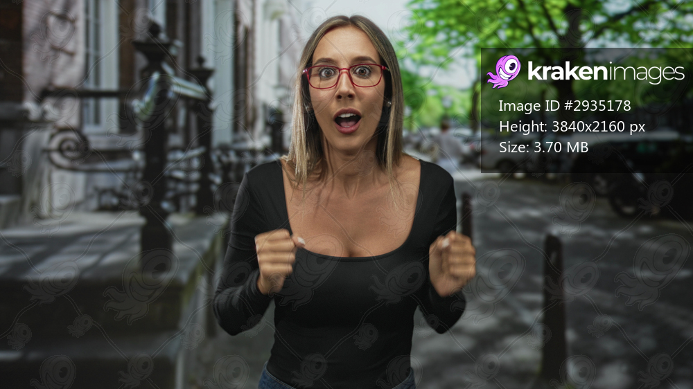 Woman wearing red glasses and black top with fists raised, visible cleavage, smiling broadly on a city street lined with green trees and parked cars; excitement celebration. - Kraken Images