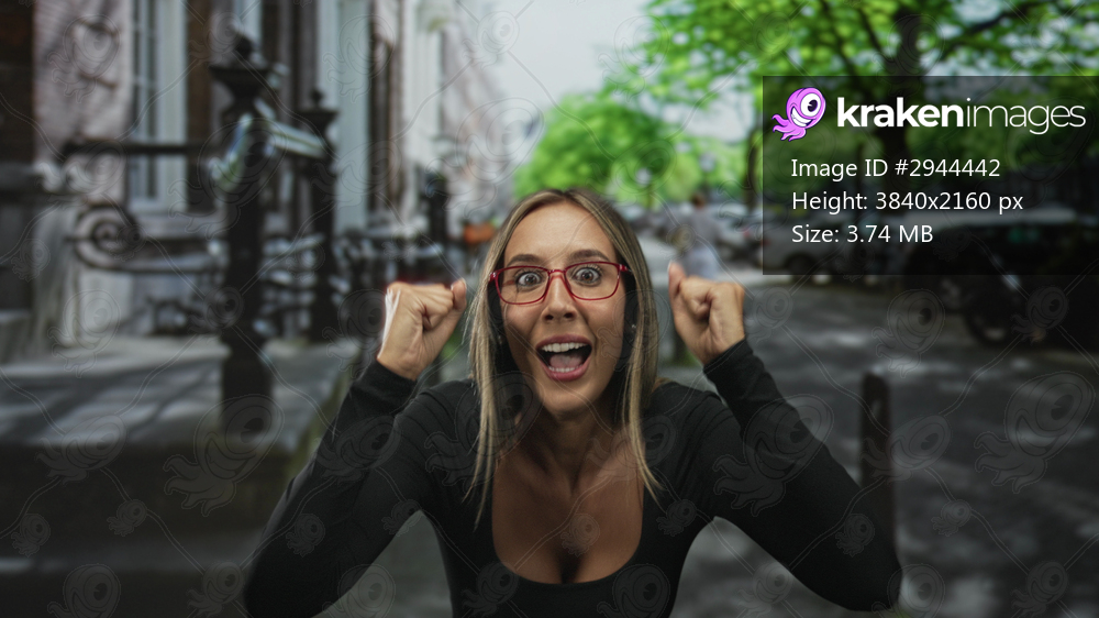 Woman wearing red glasses and black top with fists raised, visible cleavage, smiling broadly on a city street lined with green trees and parked cars; excitement celebration. - Kraken Images