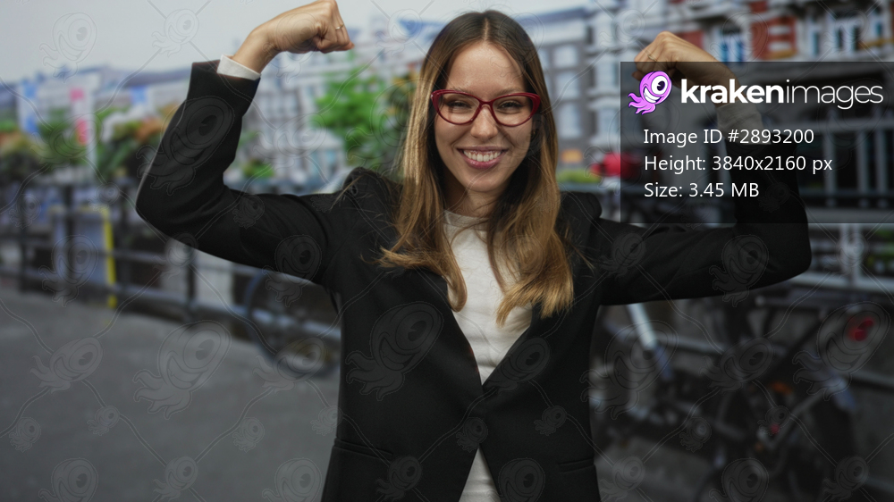 Woman wearing red glasses flexes biceps and smiles facing camera on city street by canal in amsterdam; confidence strength.