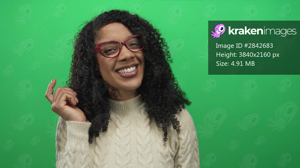 Woman wearing red glasses gently smiles and touches her curly hair in vibrant green studio; joy confidence warmth.