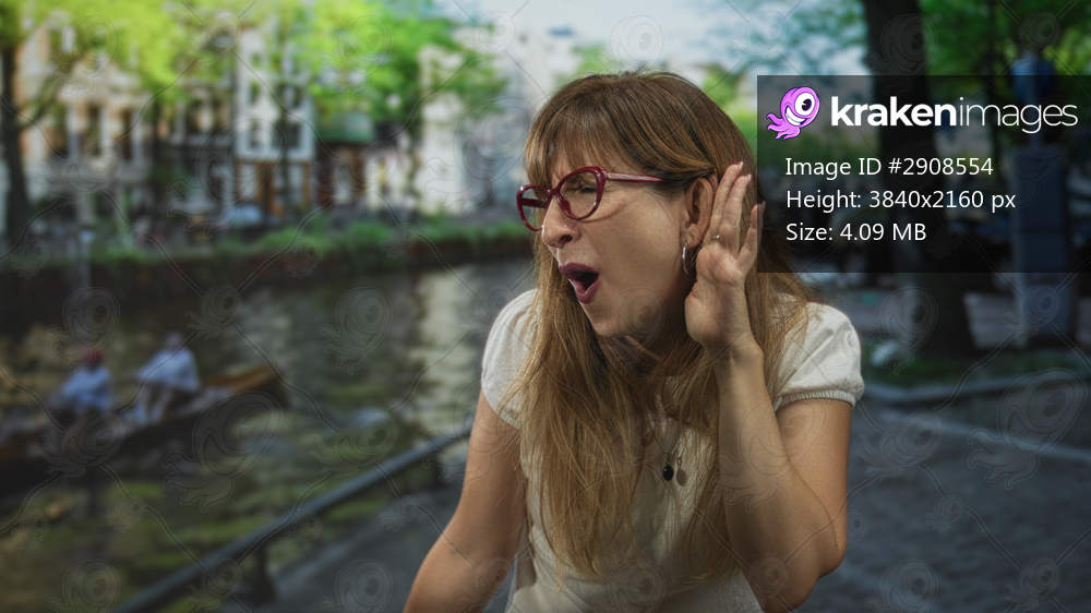 Woman wearing red glasses with hand to ear leaning on railing by canal street in amsterdam; curiosity listening.