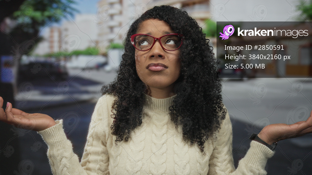 Woman wearing red glasses with hand to ear on empty street under bright sunlight; uncertainty doubt.