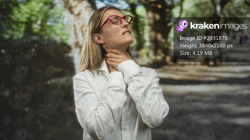 Woman wearing red glasses with hands on bare neck for choking on a tree lined street in a green park; health concern distress.