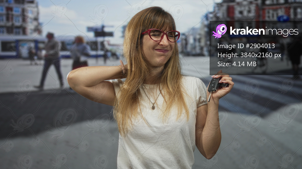Woman wearing red glasses holding car key with hand on neck in busy city street crosswalk near tram and buildings; discomfort.
