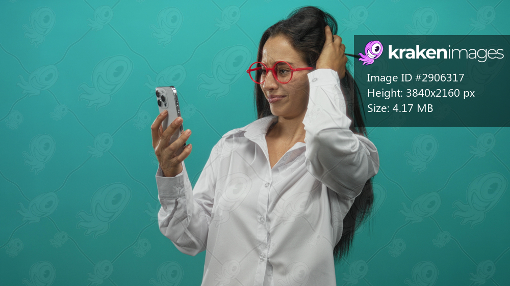 Woman wearing red glasses holding smartphone and touching hair in teal studio; surprise connectivity.