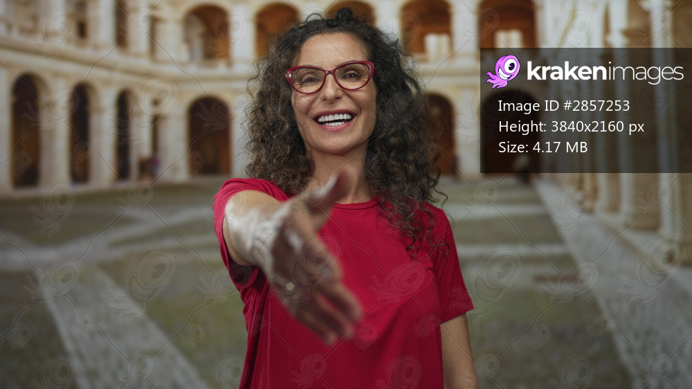 Woman wearing red glasses and red shirt extends hand for handshake in old town street; warmth connection.