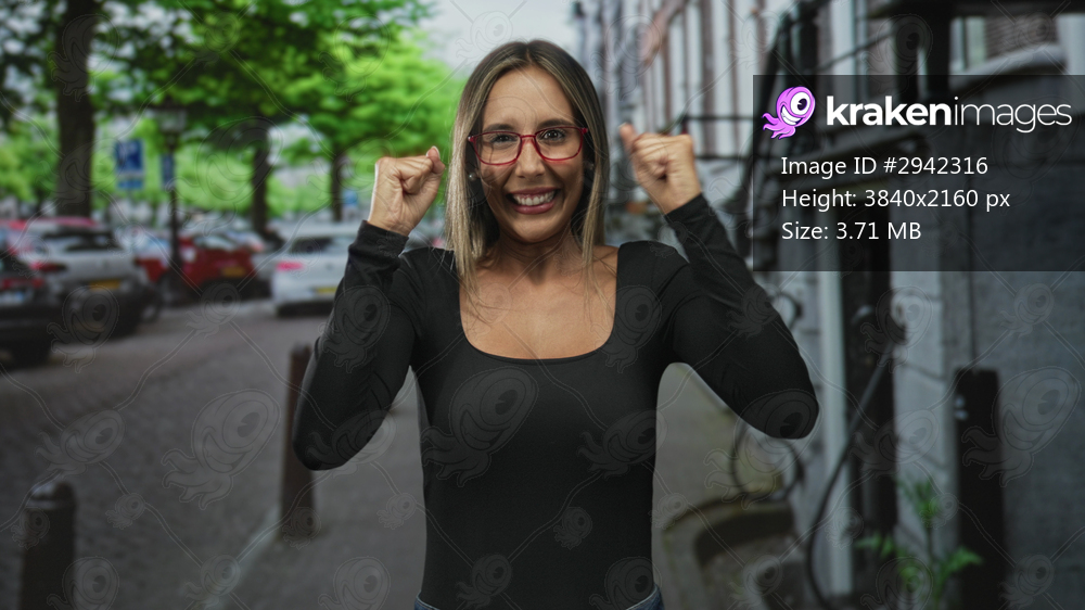 Woman wearing red glasses, smiling with fists raised and visible cleavage on a busy city street; victory celebration.