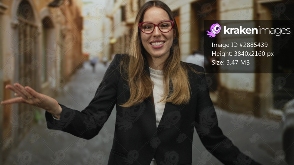 Woman wearing red glasses smiling with hand extended on old town street in front of stone buildings; confidence warmth.