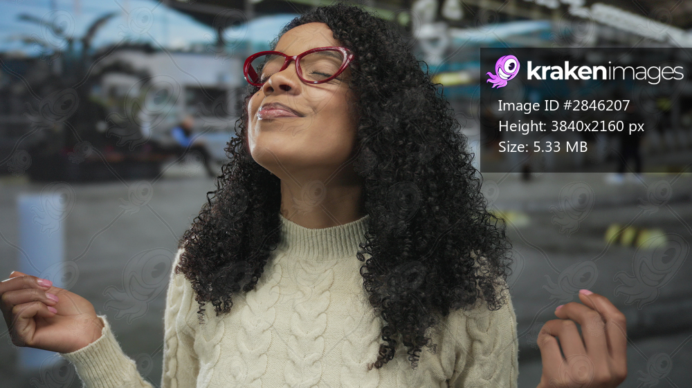 Woman wearing red glasses tilts head back to expose face and closes eyes in airport terminal; serenity.