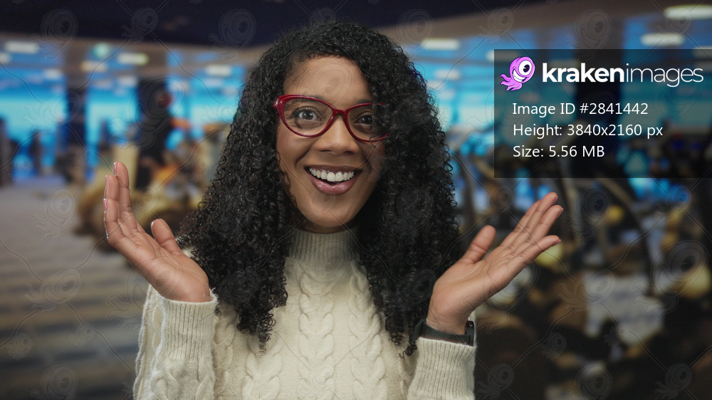Woman wearing red glasses touches cheeks and raises hands with smile amid rows of treadmills in gymnasium; surprise.
