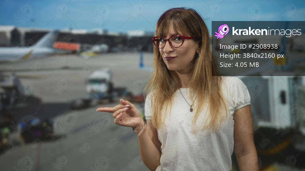 Woman wearing red glasses and white t shirt points finger toward runway at busy airport terminal; confidence travel.