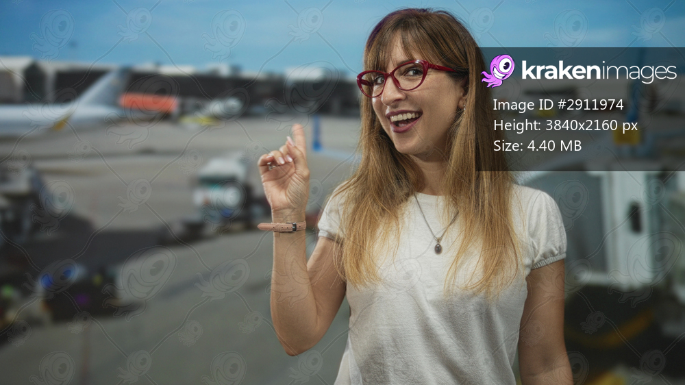 Woman wearing red glasses and white t shirt points finger toward runway at busy airport terminal; confidence travel.