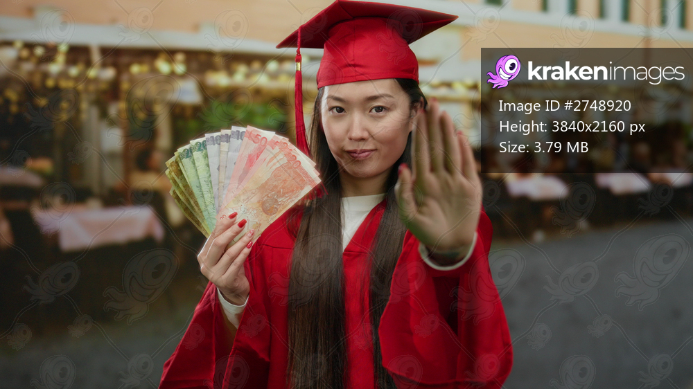 Woman wearing red graduation gown holding philippine peso banknotes outdoors in market area with a gesture of refusal on busy street proving strong context. - Kraken Images