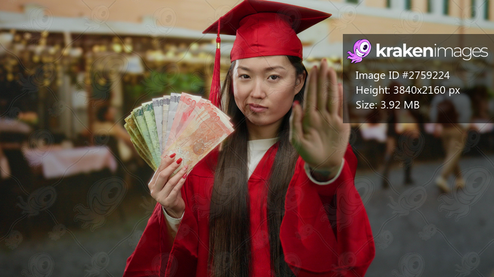 Woman wearing red graduation gown holding philippine peso banknotes outdoors in market area with a gesture of refusal on busy street proving strong context. - Kraken Images