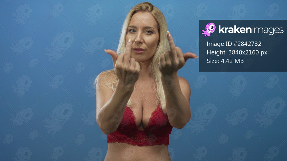 Woman wearing red lace bra and exposed cleavage shows middle fingers directly to camera in blue studio; defiance.