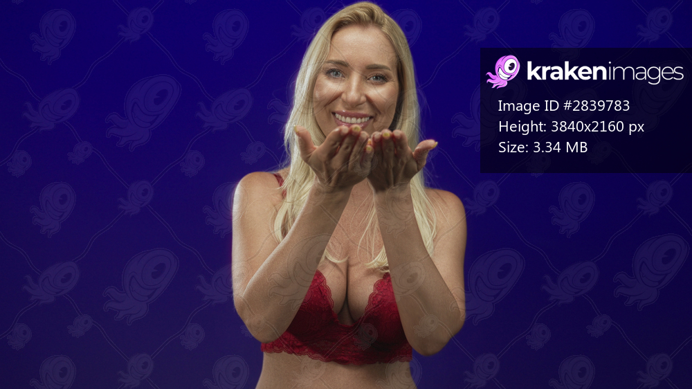 Woman wearing red lace bra shows cleavage and blows kiss in studio with blue background; affection romance.