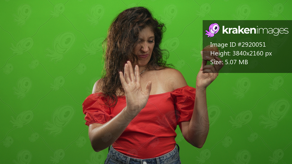 Woman wearing red off shoulder top holding muffin with raised hand and disgusted face in studio with green backdrop; disgust aversion refusal hesitation. - Kraken Images