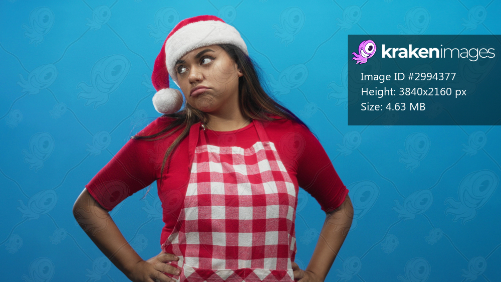 Woman wearing red santa hat and red top with checkered apron, hands on hips looking pouty in studio; holiday frustration.