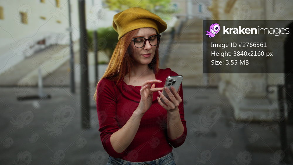 Woman wearing red shirt and beret using smartphone on city street in daylight, looking engaged and connected with urban surroundings, blending elegance and technology vividly. - Kraken Images