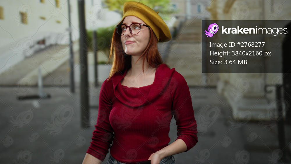Woman wearing red shirt and beret using smartphone on city street in daylight, looking engaged and connected with urban surroundings, blending elegance and technology vividly. - Kraken Images