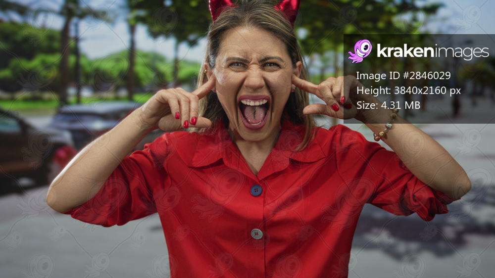 Woman wearing red shirt and devil horn headband covers ears with fingers on city street; annoyance.