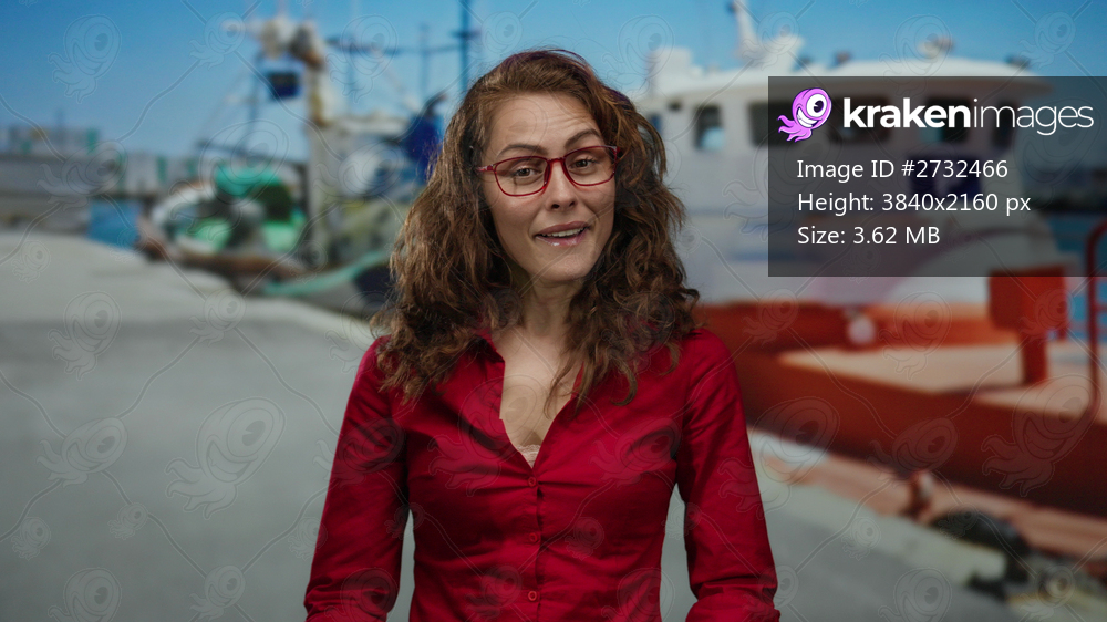 Woman wearing red shirt and glasses at a port with fishing boats, expressing various emotions, outdoors by the sea under clear sky.