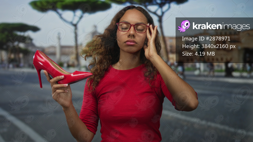 Woman wearing red shirt and glasses holding a red stiletto and touching temple on street; discomfort shopping mishap.