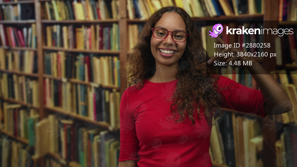 Woman wearing red shirt and glasses points finger to books on a crowded bookshelf in building while smiling and looking at camera; learning curiosity.