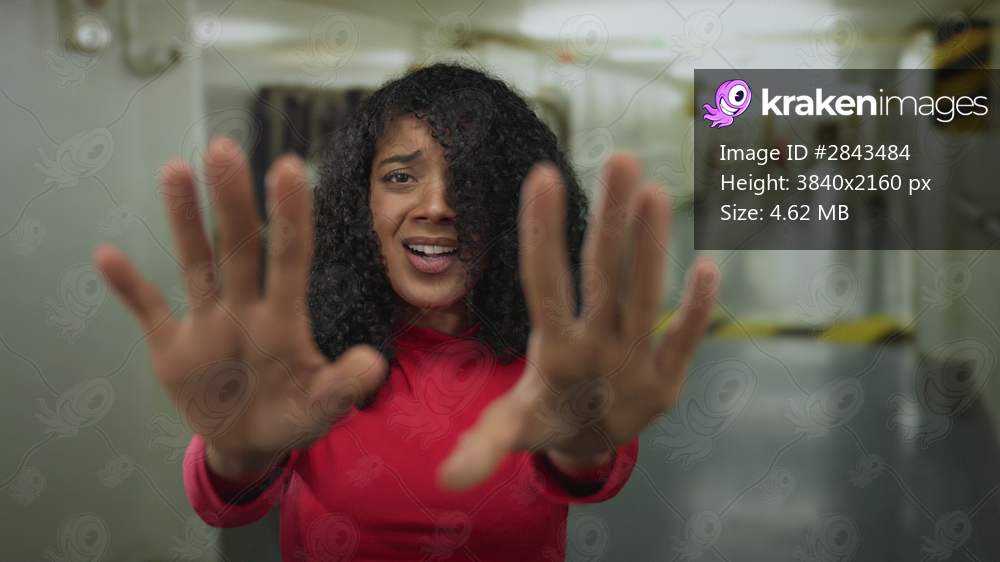 Woman wearing red shirt holds hands outward in a stop gesture in a building corridor with tense expression; fear.