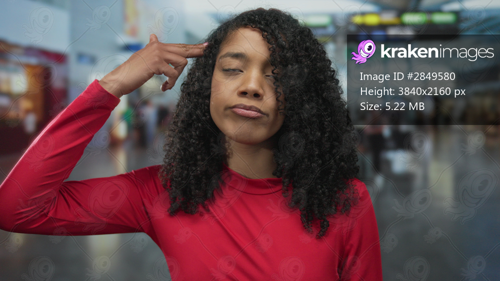 Woman wearing red shirt looks unimpressed and points finger to head in crowded busy airport; frustration.