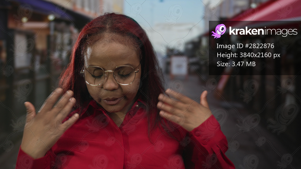 Woman wearing red shirt and round glasses fans bare face with hands on restaurant terrace walkway outdoors; heat discomfort.