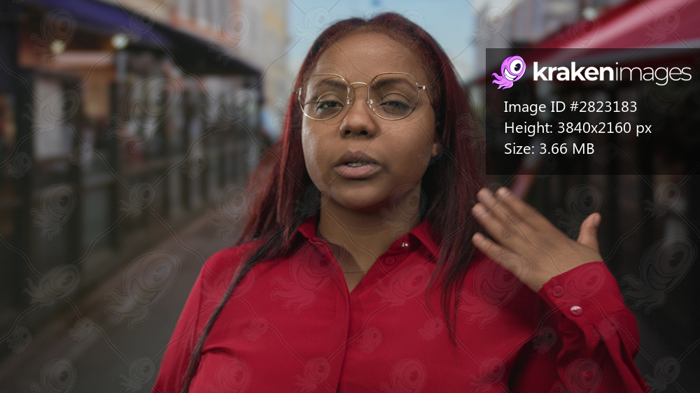 Woman wearing red shirt and round glasses fans bare face with hands on restaurant terrace walkway outdoors; heat discomfort.