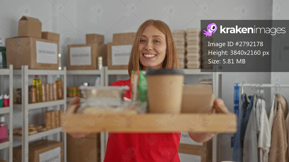 Woman wearing red shirt volunteering indoors at a donation center, organizing supplies amidst shelves of food and clothing for community support.
