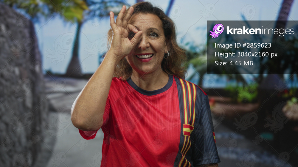 Woman wearing red soccer jersey makes ok sign on palm lined street under bright sunlight; approval support.