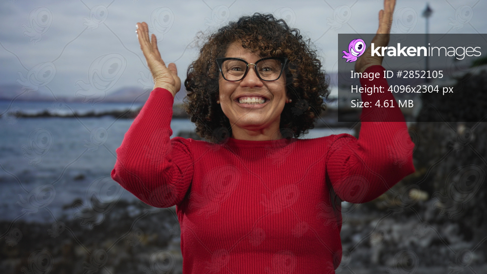 Woman wearing red sweater and glasses holds hands on head in building by the rocky seaside coast; joy.