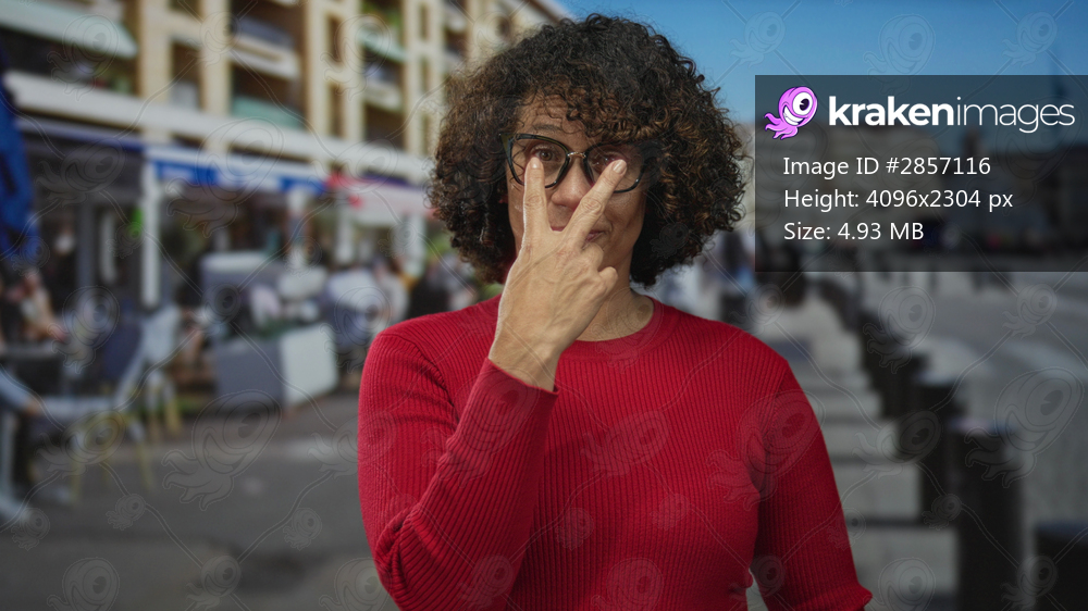 Woman wearing red sweater pointing finger outward on street in front of building facade; confidence.