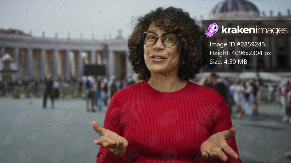 Woman wearing red sweater pointing finger to building in square at the vatican and smiling broadly; enthusiasm.