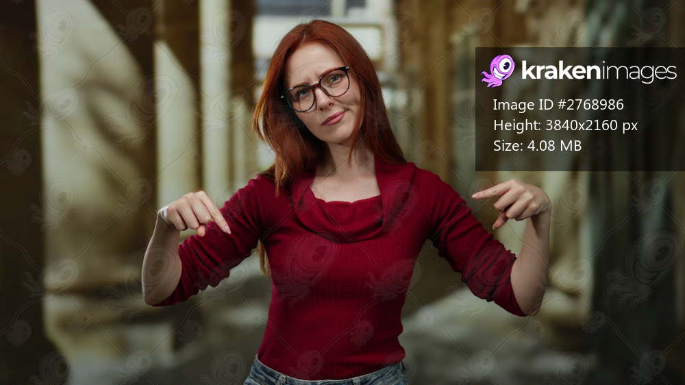 Woman wearing red sweater points downward in historical university corridor suggesting emphasis or location with intrigue and determination.