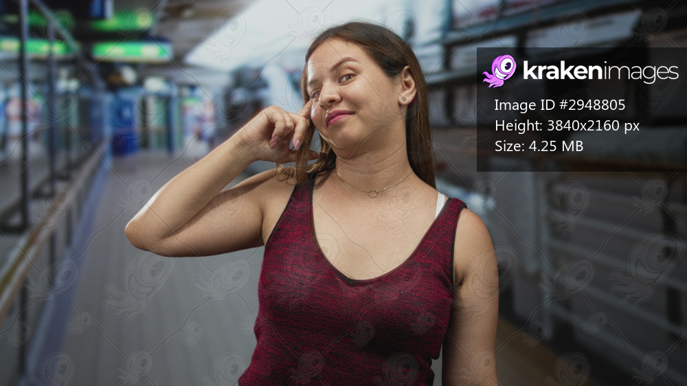 Woman wearing red tanktop with bare shoulder and finger to temple, standing on a cruise ship corridor inside a building; thoughtful reflection.