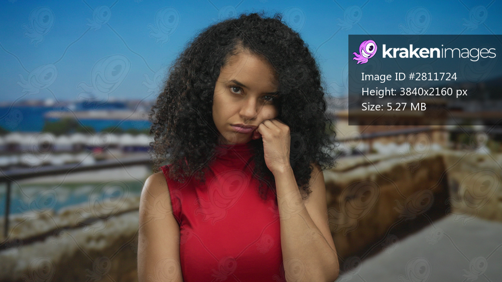 Woman wearing red top rests hand on cheek at port seaside under bright blue sky by moored boats; boredom.
