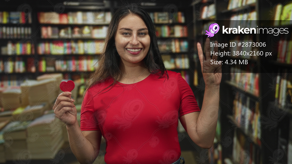 Woman wearing red tshirt holds a small heart cutout and points index finger toward camera in library aisles; love romance joy.