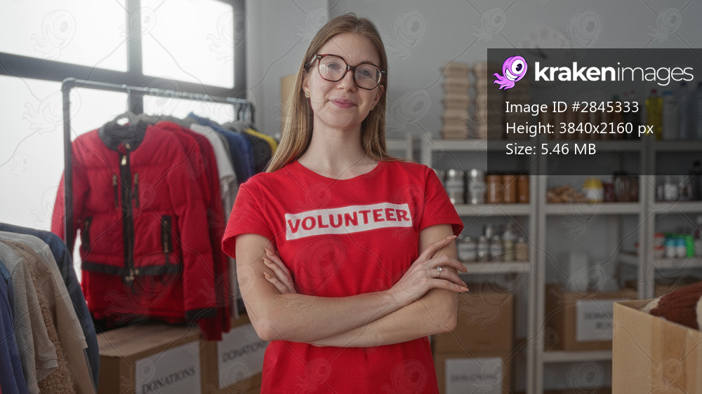 Woman wearing red volunteer shirt and glasses with crossed arms stands in a donation center building among packed boxes and shelves; compassion.