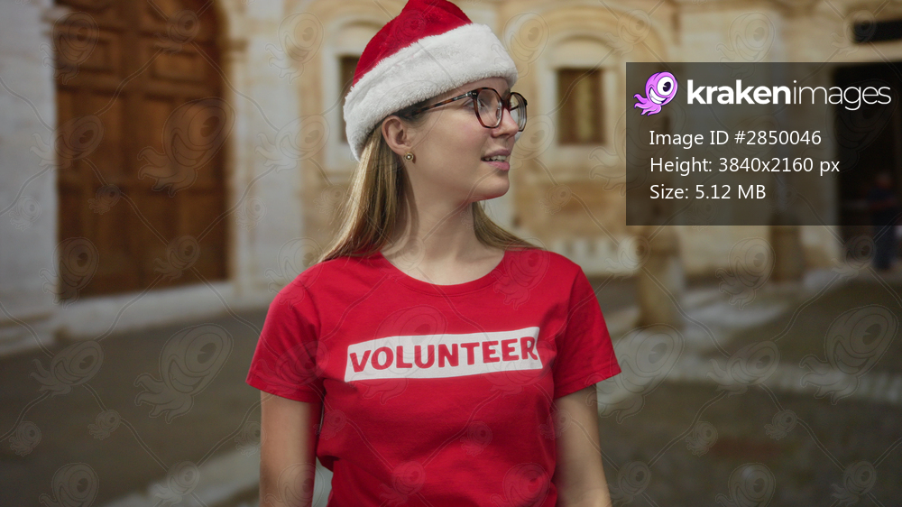 Woman wearing red volunteer shirt and santa hat with hand on forehead in front of stone building; fatigue.