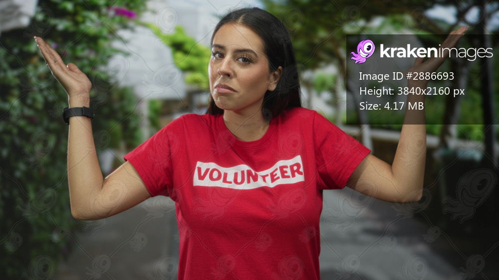 Woman wearing red volunteer tshirt raises both hands in a shrug gesture on a tree lined street with greenery; confidence service community outreach.