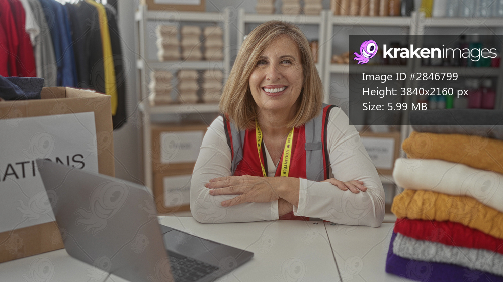 Woman wearing red volunteer vest folds clothes on table in building; community involvement generosity.