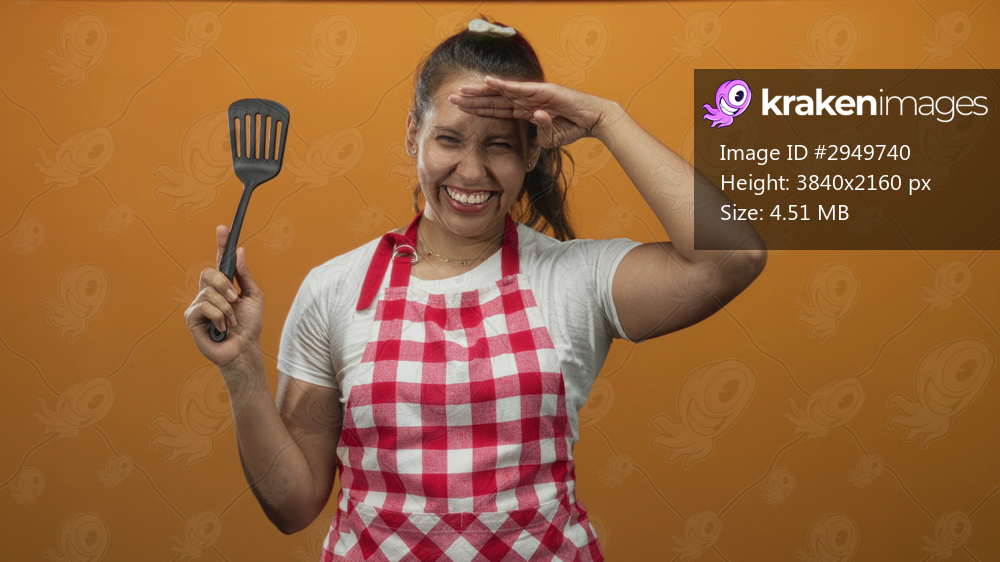 Woman wearing red and white check apron and white t shirt holding spatula with hand shading eyes in orange studio; joy playful cooking moment.