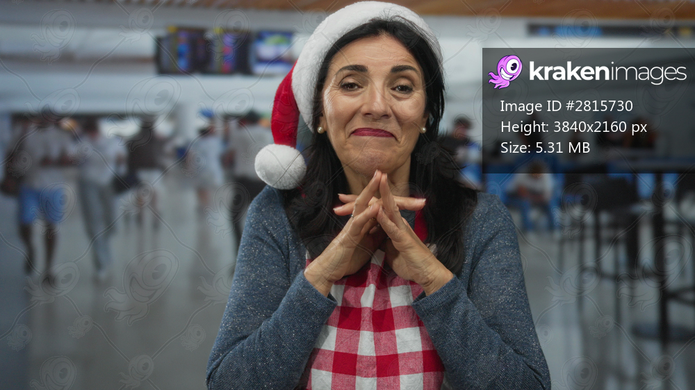Woman wearing red and white gingham apron smiles while holding strap with hands in busy airport terminal; holiday joy.