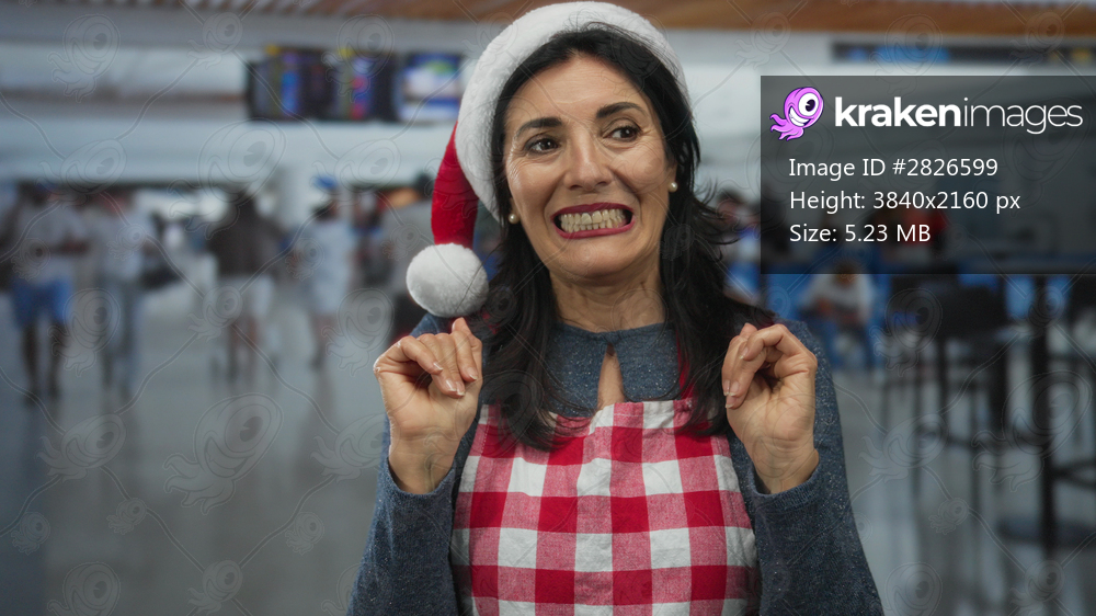 Woman wearing red and white gingham apron smiles while holding strap with hands in busy airport terminal; holiday joy.