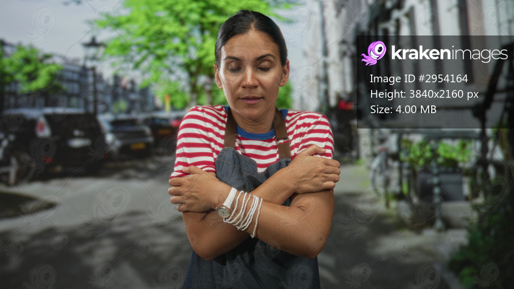 Woman wearing red and white striped shirt and denim apron with crossed arms on street lined with parked cars and bicycles; concerned resilience.