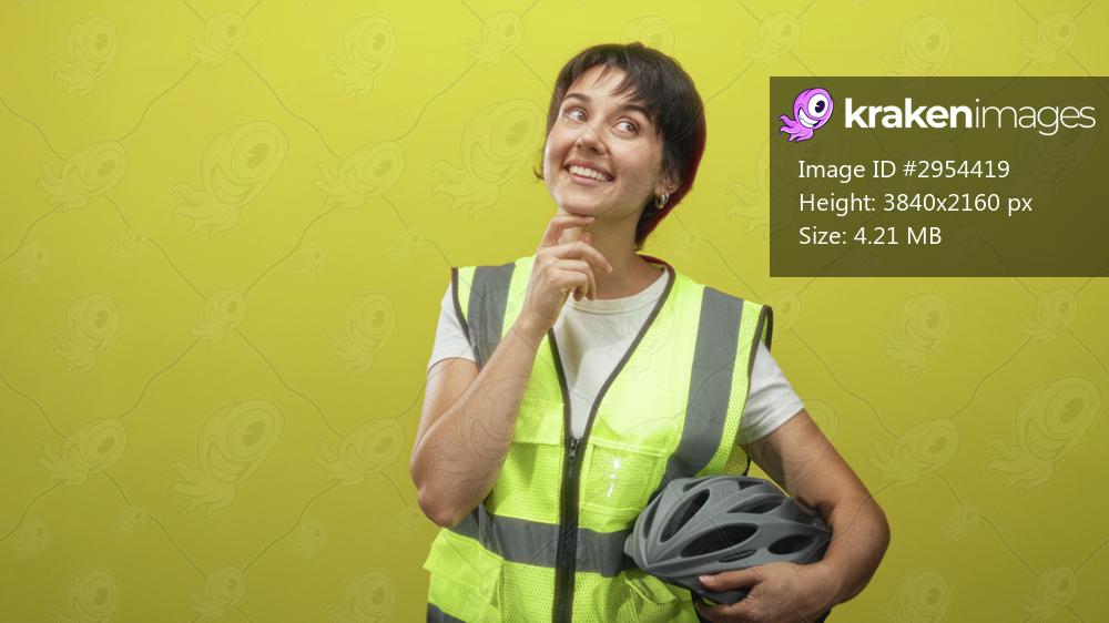 Woman wearing reflective vest, short hair, smiling, holding bicycle helmet and touching chin in studio; thoughtful safety.